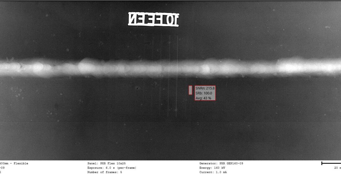 We are making a standard scan of a 8x400mm steel pipe. The PXR Flexible delivers crystal clear image quality over a long sector, much longer than required in this case. And on the other hand the PXR GEN160-09, beast on batteries, shot the image in net time of 5 x 6 seconds, 30 seconds in total.